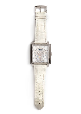 the bezel containing 88 round brilliant cut diamonds weighing approximately 0.95 carat total, 41.00 x 41.00 mm case dimensions, mother-of-pearl and silvered dial signed MILUS, three 20 second retrograde subdials, Arabic numerals, luminous hands, self winding movement, exhibition crystal case back affixed by eight screws, white leather straps and tang buckle signed Milus.