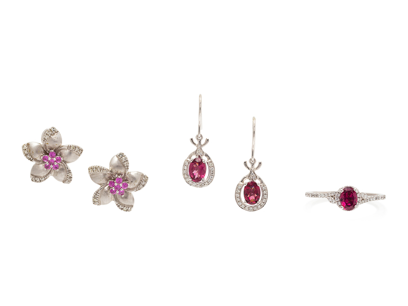 consisting of a ring containing one oval shape garnet and 53 round brilliant cut diamonds weighing approximately 0.25 carat total, a pair of earrings containing two oval shape garnets and 36 round brilliant cut diamonds weighing approximately 0.06 carat total, together with a pair of 14 karat flower motif earclips by Levian containing 12 round pink sapphires, posts with clip backs.