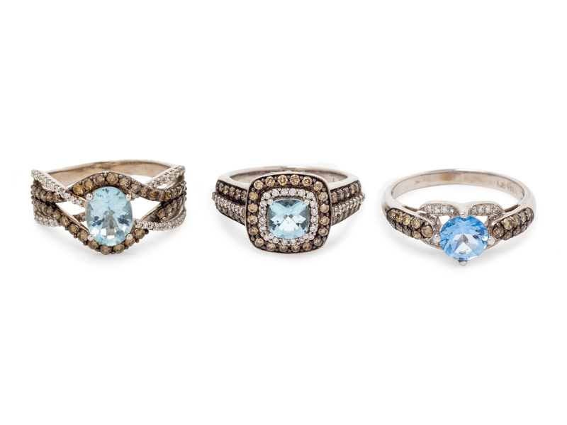 consisting of a ring containing one cushion shape aquamarine and 78 diamonds and colored diamonds (origin of color not tested) weighing approximately 0.75 carat total, a ring containing one oval shape aquamarine and 76 diamond and colored diamonds (origin of color not tested) weighing approximately 0.85 carat total, together with a round blue topaz and 34 diamonds and colored diamonds (origin of color not tested) weighing approximately 0.23 carat total.