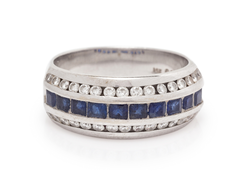 containing ten french cut sapphires measuring approximately 2.75 x 2.47 mm and two rows of 32 round brilliant cut diamond weighing approximately 0.64 carat total.