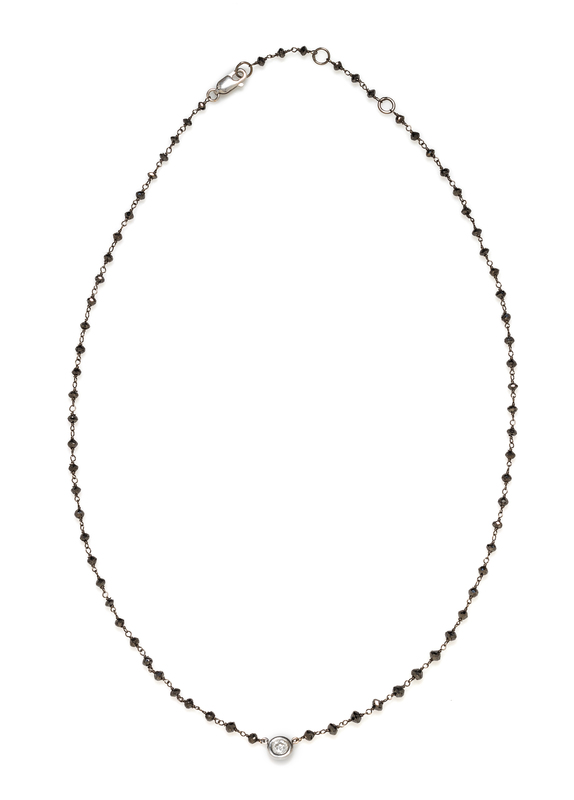 consisting of numerous rondelle black diamond (origin of color not tested) beads measuring approximately 2.65-3.65 mm in diameter and one round brilliant cut diamond weighing approximately 0.25 carat.