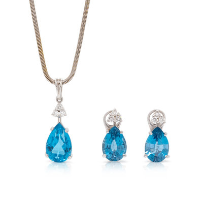 consisting of a pair of earclips containing two pear shape blue topaz measuring approximately 13.10 x 8.80 mm and six round brilliant cut diamonds weighing approximately 0.30 carat total, together with a pendant containing one pear shape topaz measuring approximately 14.50 x 9.50 x 8.00 mm and three round brilliant cut diamonds weighing approximately 0.12 carat total suspended from a snake link chain.