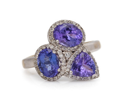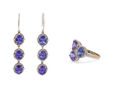 consisting of an 18 karat ring containing two oval shape and one triangular mixed cut tanzanite and 67 round brilliant cut diamonds weighing approximately 0.14 carat total, together with a pair of 14 karat earrings containing six oval shape tanzanites and 120 round brilliant cut diamonds weighing approximately 0.50 carat total.