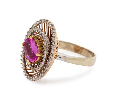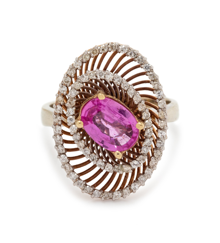 A 14 Karat Bicolor Gold, Pink Sapphire and Diamond Ring,