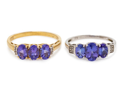 consisting of a white gold ring containing three oval shape tanzanites and four round brilliant cut diamonds, together with a yellow gold ring containing three oval shape tanzanites and 10 baguette cut diamonds.
