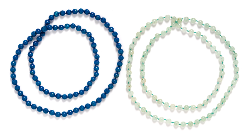 consisting of a blue hardstone bead necklace and a green hardstone bead necklace, both strung knotted in and endless style.