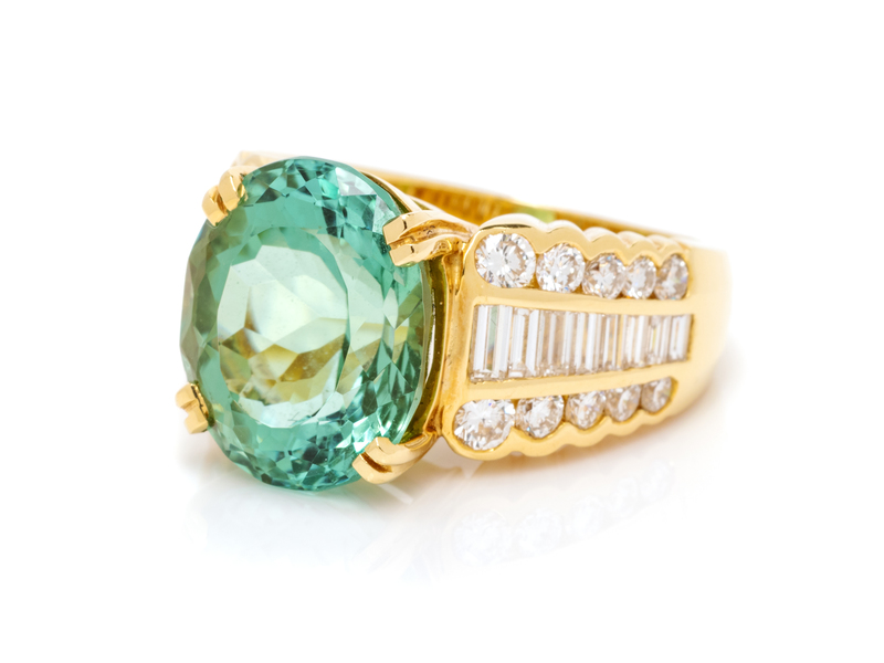 containing one oval mixed cut tourmaline measuring approximately 13.95 x 11.75 x 8.85 mm, 20 round brilliant cut diamonds weighing approximately 0.60 carat total, 16 baguette diamonds weighing approximately 0.95 carat total and one trillion cut diamond weighing approximately 0.03 carat.
