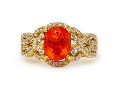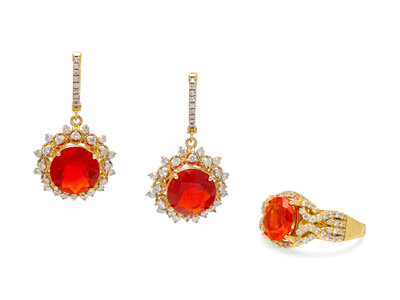 consisting of an 18 karat gold ring containing one oval shape fire opal and 65 round brilliant cut diamonds weighing approximately 0.75 carat total, together with a pair of 14 karat earrings containing two round mixed cut fire opals and 66 round brilliant cut diamonds weighing approximately 0.80 carat total.