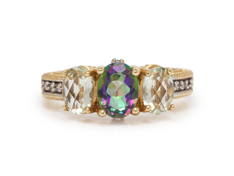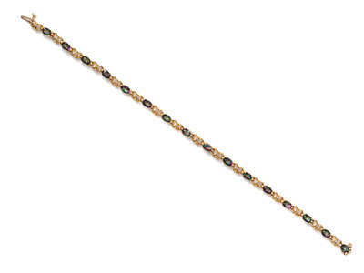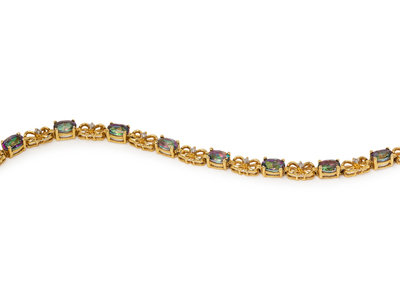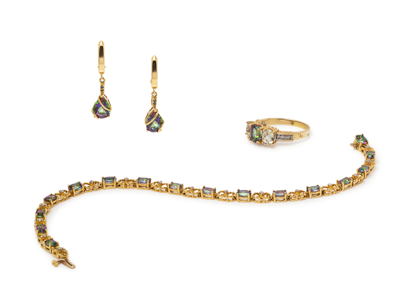 consisting of a 14 karat ring containing one oval shape mystic topaz, two oval shape green gemstones and 10 round brilliant cut diamonds weighing approximately 0.05 carat total, a 14 karat bracelet containing 16 oval shape mystic topaz and 16 round brilliant cut diamonds weighing approximately 0.04 carat total, together with a pair of earrings containing two pear shape mystic topaz and four round brilliant cut irradiated diamonds weighing approximately 0.01 carat total.