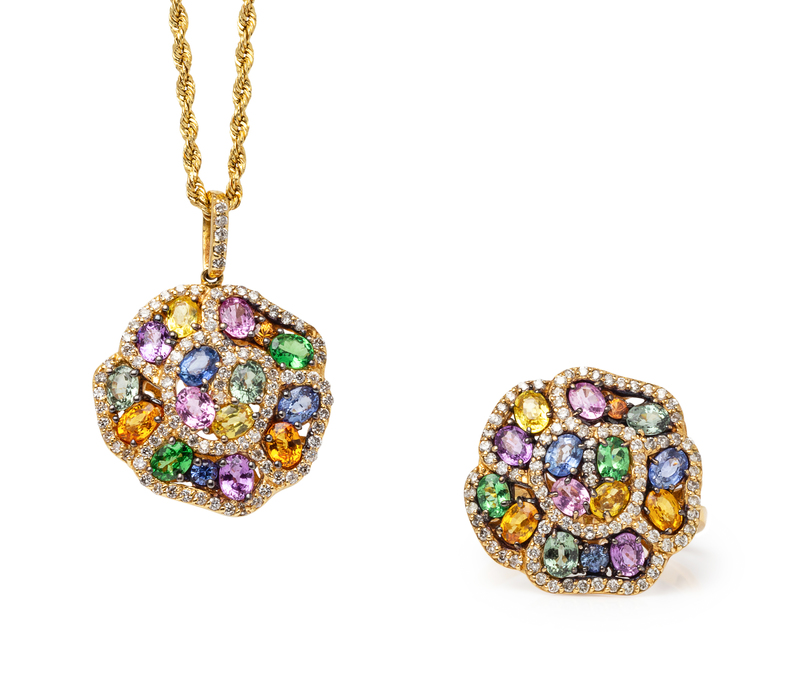 consisting of a ring containing 16 oval and round multi color sapphires and 89 round brilliant cut diamonds weighing approximately 0.25 carat total, together with a matching pendant necklace containing 16 oval and round multi color sapphires and 93 round brilliant cut diamonds weighing approximately 0.27 carat total.