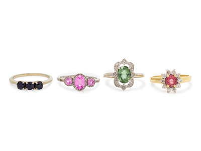 consisting of a 14 karat white gold ring containing three sapphires, a 10 karat white gold ring containing three oval shape pink sapphires and 37 single cut diamonds weighing approximately 0.03 carat total, a white gold ring containing one oval shape green tourmaline and 20 round brilliant cut diamonds weighing approximately 0.06 carat total, together with a 14 karat yellow gold ring containing one round pink tourmaline and 10 round brilliant cut diamonds weighing approximately 0.30 carat total.