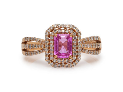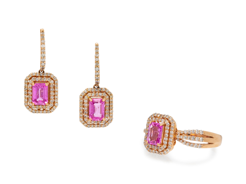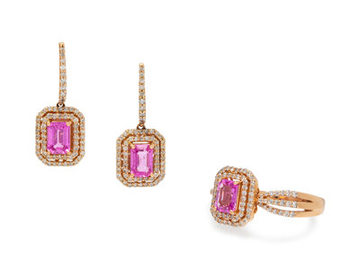 consisting of a ring containing one octagonal step cut pink sapphire and 98 round brilliant cut diamonds weighing approximately 0.25 carat total, together with a pair of earrings containing two octagonal step cut pink sapphires and 134 round brilliant cut diamonds weighing approximately 0.30 carat total.