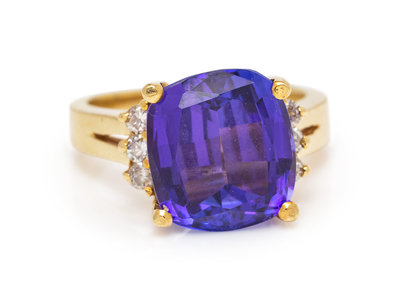 containing one cushion cut tanzanite measuring approximately 11.85 x 10.70 x 7.20 mm and six round brilliant cut diamonds weighing approximately 0.15 carat total.