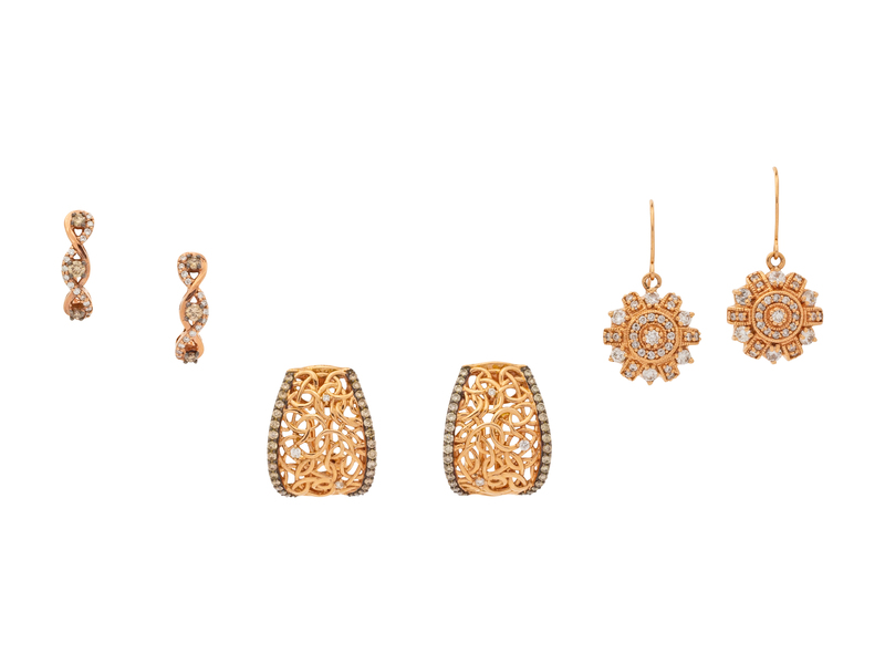 A Collection of 14 Karat Rose Gold, Diamond and Colored Diamond Earrings,