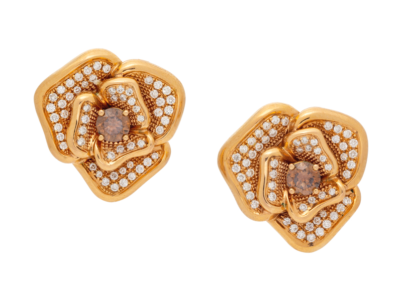 A Pair of 18 Karat Rose Gold, Colored Diamond and Diamond Flower Motif Earclips, Le Vian,