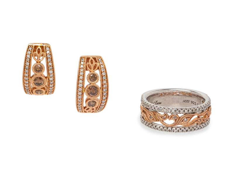 consisting of a rose gold and sterling silver ring by Neil Lane containing 68 single cut diamonds weighing approximately 0.13 carat total, together with a pair of earclips by Levian containing six round brilliant cut colored diamonds (origin of color not tested) weighing approximately 0.48 carat total and 68 round brilliant cut diamonds weighing approximately 0.20 carat total, posts with clip backs.