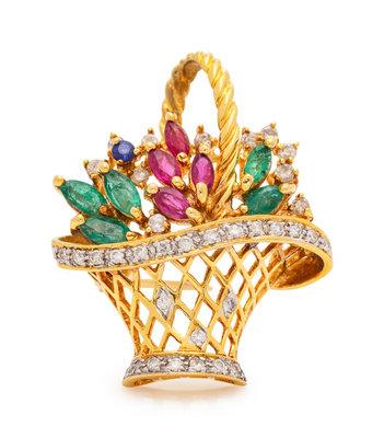 An 18 Karat Yellow Gold, Diamond and Multigem Basket Brooch,