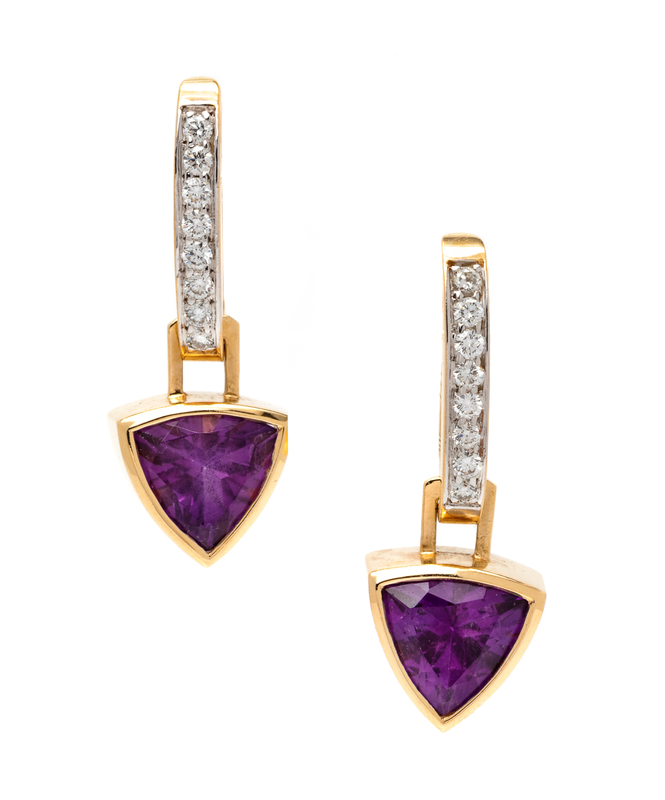 containing 16 round brilliant cut diamonds weighing approximately 0.30 carat total, with removable drops containing two triangular amethyst measuring approximately 8.80 x 9.10 x 6.10 mm.