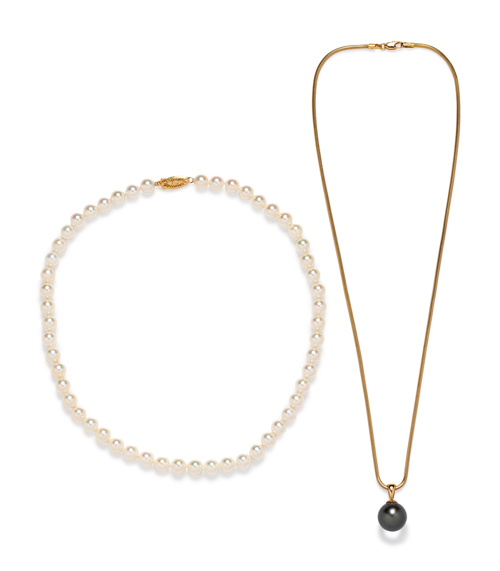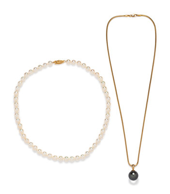 consisting of an Italian snake chain necklace, a pendant containing one Tahitian pearl measuring approximately 13.10 mm in diameter, together with a necklace containing pearls measuring approximately 6.65 mm in diameter, strung knotted with a 14 karat gold clasp.