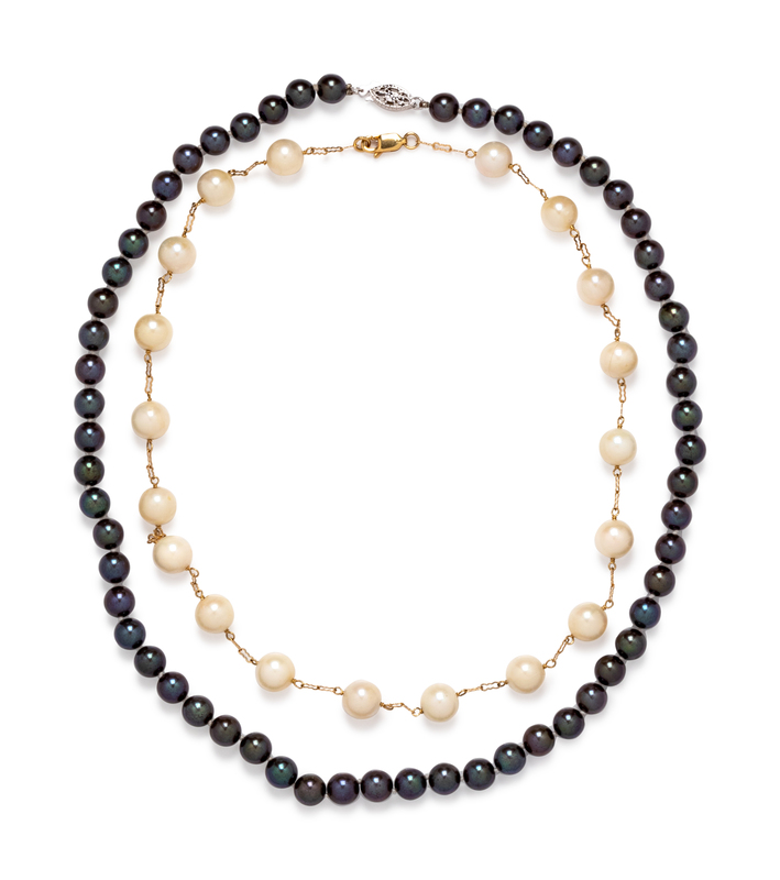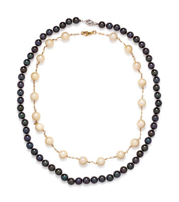 consisting of a yellow gold crinkle chain necklace interspersed with 19 pearls measuring approximately 8.35 mm in diameter, together with a necklace containing grey pearls measuring approximately 6.60 mm in diameter, strung knotted with a white gold clasp.