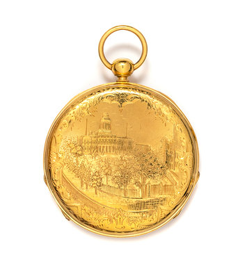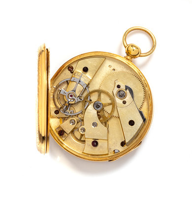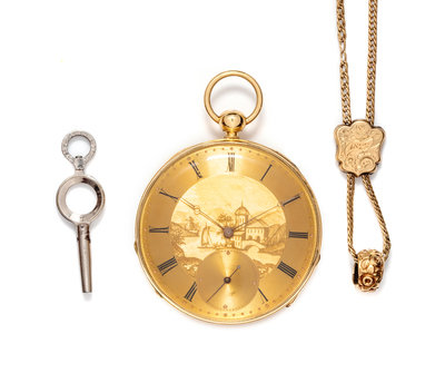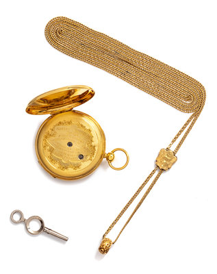 consisting of a gold pocketwatch containing a 45.00 mm case diameter, etched gold dial, Roman numerals, gold breguet hands, subdial for seconds at 6 o'clock, key wound movement, together with a long chain with sliding pendant engraved 'Lord 1823' and a gold floral bead.