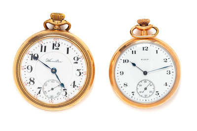 consisting of a pocket watch by Elgin with 48.00 mm case diameter, white dial signed ELGIN, black Arabic numerals, blued steel Poires Stuart hands, subdial for seconds at 6 o'clock, manual wind movement signed ELGIN NAT'L WATCH CO. U.S.A., together with a pocket watch by Hamilton with 55.00 mm case diameter, white dial signed Hamilton, black Arabic numerals, blued steel spade hands, subdial for seconds at 6 o'clock, manual wind 23 jewel movement signed Hamilton Watch Co.