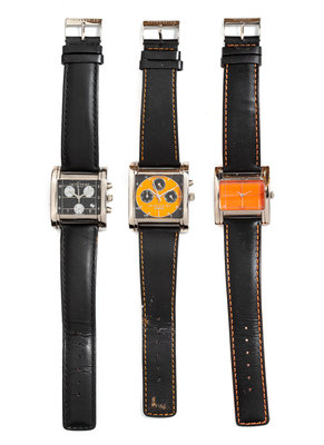 consisting of a watch with 33.00 x 35.00 mm case dimensions, orange and black dial signed TATEOSSIAN, applied steel Roman numerals, luminous steel pencil hands, subdials for day, date and month, stainless steel movement, black leather strap, steel tang buckle, a watch with 29.00 x 32.00 mm case dimensions, black dial signed TATEOSSIAN, applied steel Arabic numerals, luminous steel pencil hands, three subdials and date aperture, quartz movement, black leather strap with steel tang buckle, together with a watch with 26.00 x 32.00 mm case dimensions, orange dial signed TATEOSSIAN, applied steel Roman numerals, steel pencil hands, quartz movement, black leather strap, steel tang buckle.