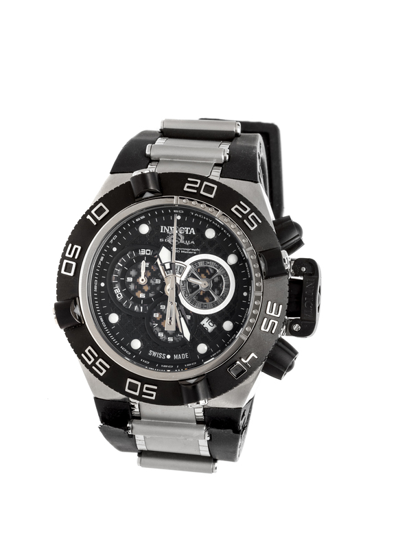 50.00 mm case diameter, black textured dial signed INVICTA, luminous sword hands, white dot numerals, skeletonized subdials at 3, 6 and 9 o'clock, outer tachymeter dial, screw down case back, steel and rubber strap, tang buckle.