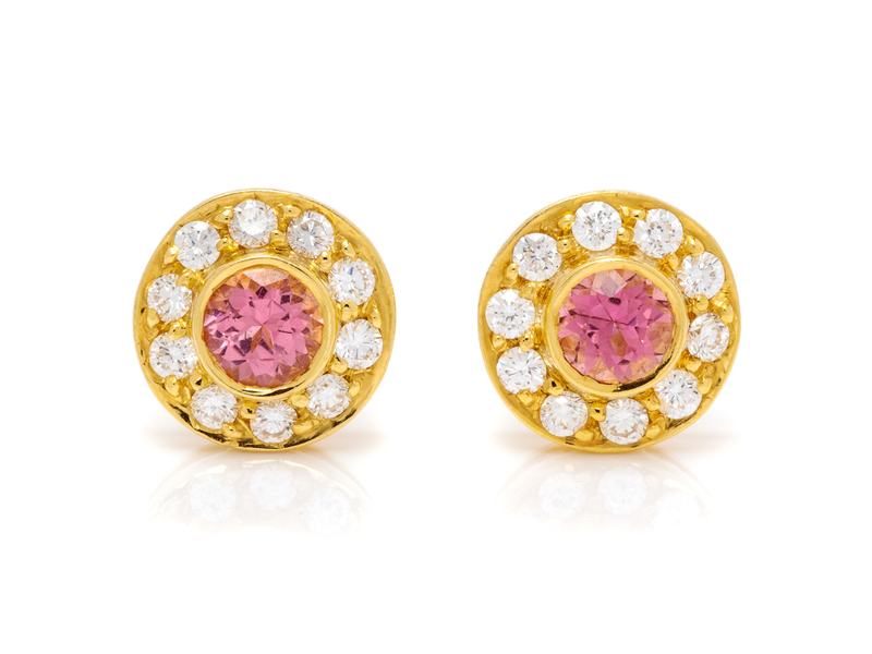 containing two round brilliant cut pink tourmaline measuring approximately 4.00 mm in diameter and 20 round brilliant cut diamonds weighing approximately 1.00 carat total.