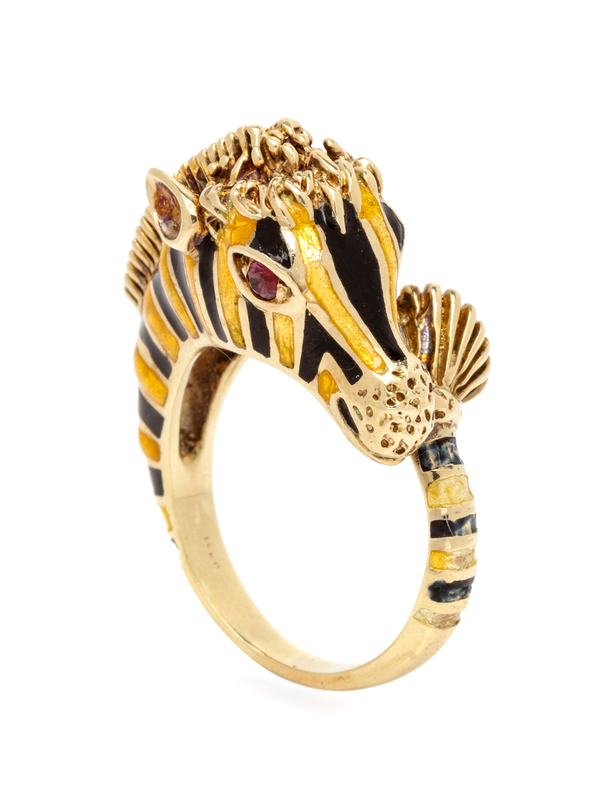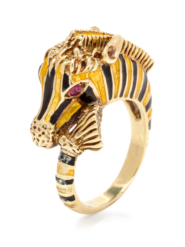 A 14 Karat Yellow Gold, Ruby and Enamel Zebra Ring, Martine,