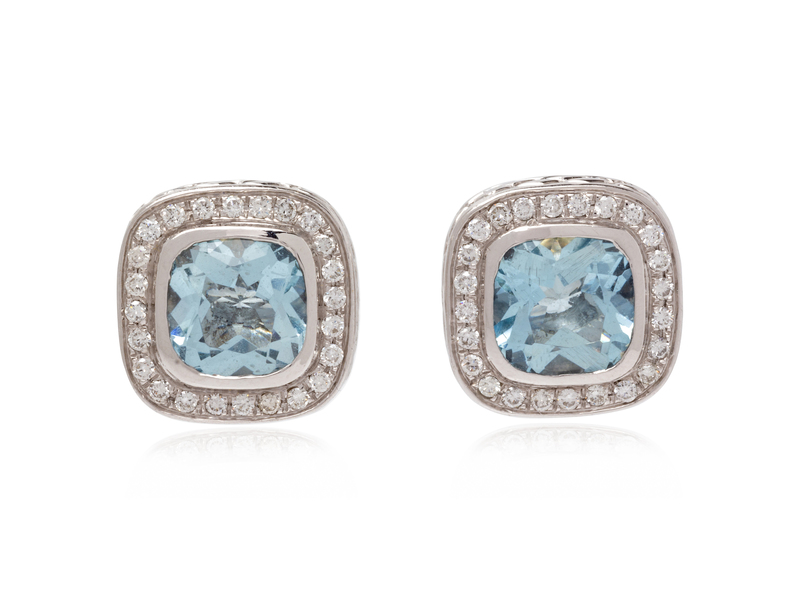 containing two cushion shape aquamarines measuring approximately 9.40 x 9.35 mm and 48 round brilliant cut diamonds weighing approximately 0.50 carat total, posts with clip backs.