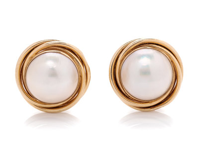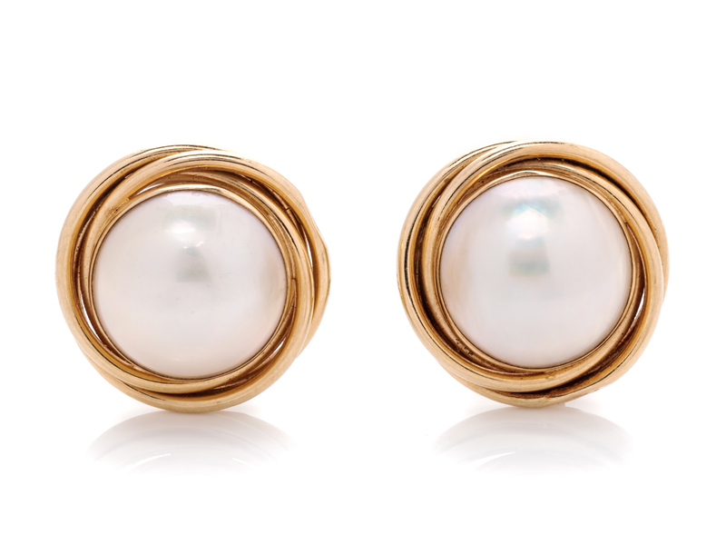 A Pair of 14 Karat Yellow Gold and Cultured Mabe Pearl Earclips,