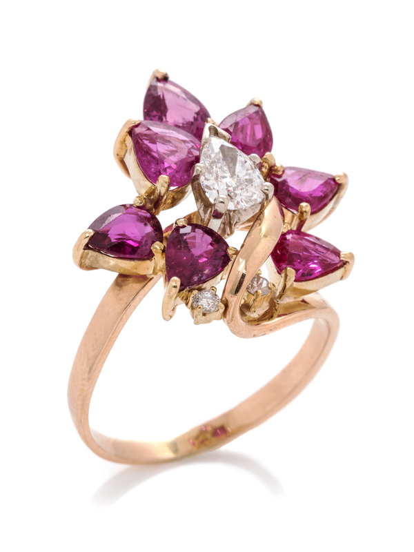 containing one pear shape diamond weighing approximately 0.40 carat, two round brilliant cut diamonds weighing approximately 0.04 carat total and seven pear shape mixed cut rubies (origin not tested).
