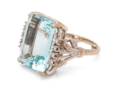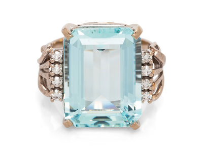 containing one octagonal step cut aquamarine measuring approximately 17.04 x 12.85 x 7.54 mm and eight round brilliant cut diamonds weighing approximately 0.10 carat total, together with a mixed metal shank.