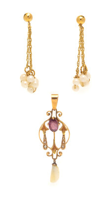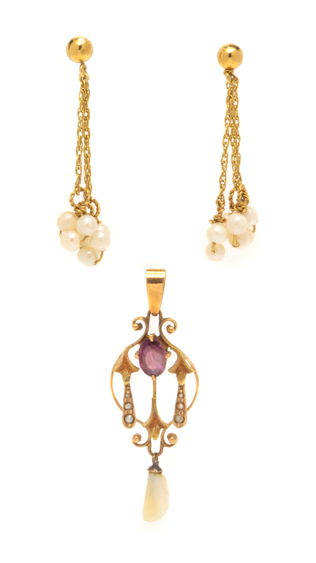 consisting of a pair of earrings with cable chain drops containing 18 pearls measuring approximately 3.10-3.20 mm in diameter, together with a yellow gold pendant containing one oval shape mixed cut amethyst measuring approximately 5.70 x 4.25 mm, one drop Baroque pearl measuring approximately 4.00 mm wide and six seed pearls.