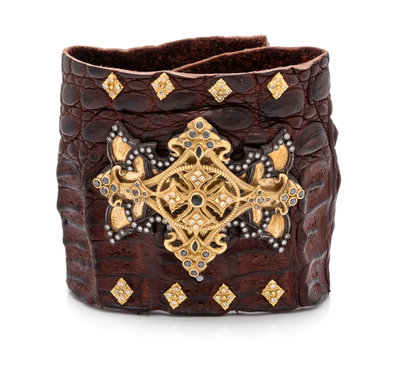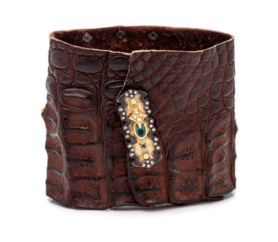 containing one oval and one round mixed cut green tourmaline, numerous round brilliant cut diamonds weighing approximately 0.35 carat total, and 30 round mixed cut black diamonds weighing approximately 0.45 carat total surmounted on a brown alligator cuff bracelet.