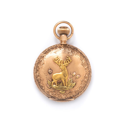 42.00 mm case diameter, white dial signed ELGIN, black Roman numerals, blued steel spade hands, subdial for seconds at 6 o'clock, stem wound and set gilt movement signed Elgin Nat'l Watch Co., foliate engraved case, the reverse with blank cartouche, applied yellow gold stag.