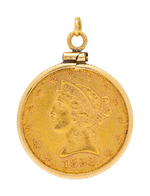 containing a US $5 dollar Liberty head gold coin, dated 1886, within a yellow gold bezel setting.