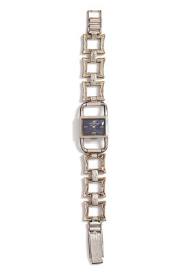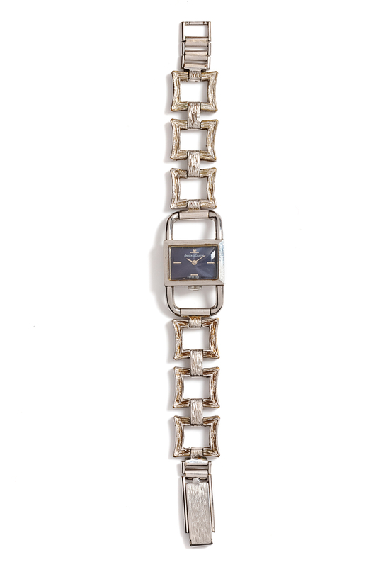15.00 x 20.00 mm case dimensions excluding lugs, black dial signed JAEGER-LECOULTRE, applied steel baton numerals, steel pencil hands, rectangular bezel with stirrup shape lugs, snap on case back, manual wind 17 jewel movement signed LeCOULTRE Co, textured stainless steel link bracelet, fold over clasp.