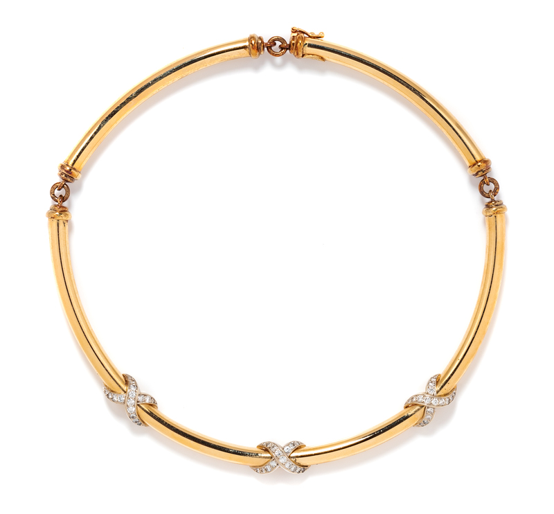 consisting of a curved tubular yellow gold necklace surmounted with three white gold X motifs containing 48 round brilliant cut diamonds weighing approximately 1.20 carats total.