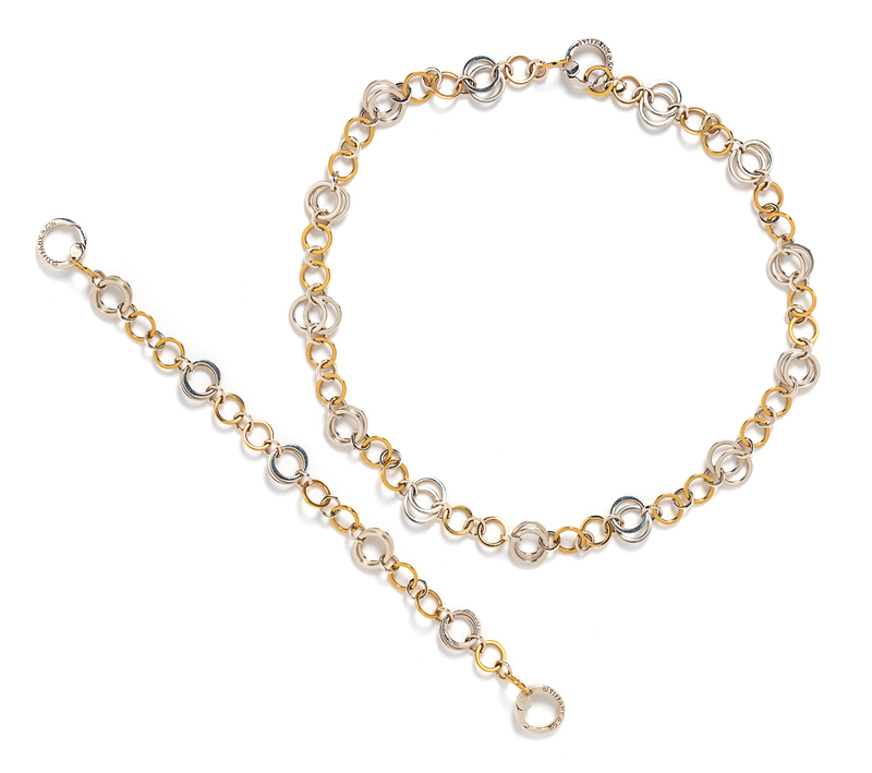 consisting of a necklace with sterling silver and 18 karat yellow gold circular links, together with a matching bracelet.