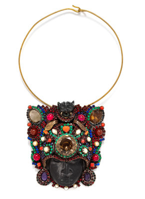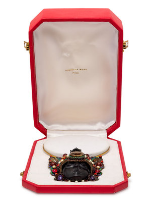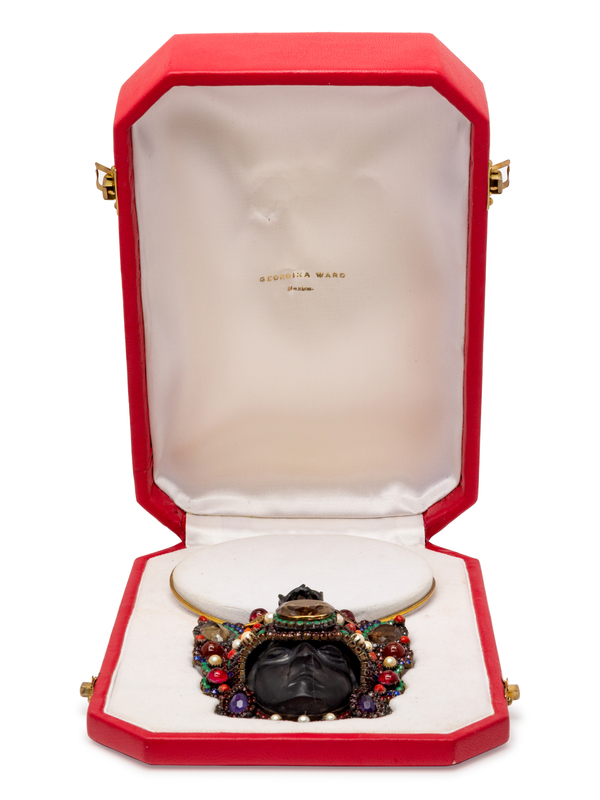 unsigned, consisting of a warrior wearing a headdress, containing numerous cabochon mixed cut gemstones including carnelian, coral, carved onyx, 11 cultured and faux pearls and numerous rhinestones, suspended from a collar necklace.