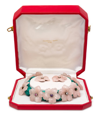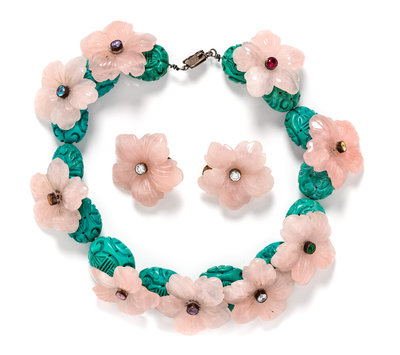 unsigned, consisting of a necklace containing 14 carved turquoise beads (origin not tested) and nine carved rose quartz flowers with multicolor faceted glass centers, together with a pair of carved rose quartz flower earclips with faceted glass centers, posts with clip backs.