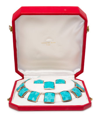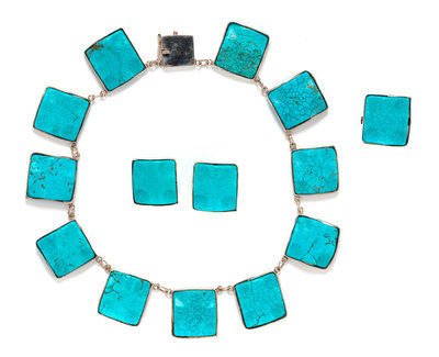 unsigned, consisting of a necklace containing 11 square shape turquoise plaques measuring approximately 30.00 x 28.00 mm, together with a matching ring and pair of stud earrings.