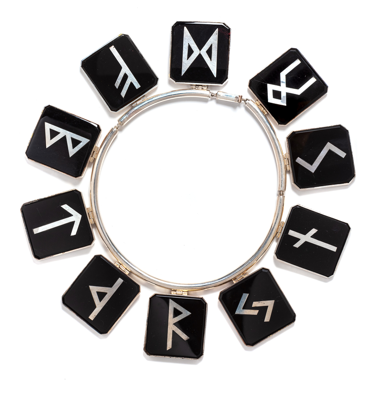 unsigned, consisting of 10 onyx plaques with inlaid silver Celtic Rune symbols.