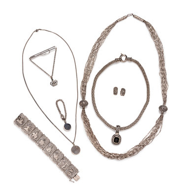 consisting of a tiebar with chain and sterling silver crown charm, a pendant and chain, a keychain with sterling silver disc pendant, a silver tone pendant necklace, a filigree bracelet, a popcorn link necklace and pendant, together with a marcasite demi-parure consisting of a multistrand necklace and hoop earrings.