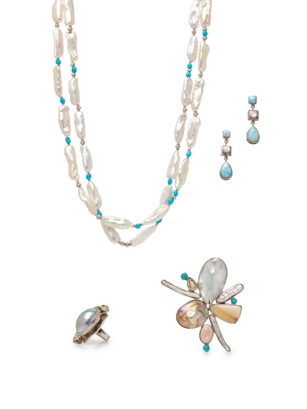consisting of a ring containing one blister pearl by Avi Soffer, a pair of earrings containing six hardstones by AJ, a brooch containing various shape pearls, shell and hardstones, together with a necklace containing Baroque pearls and turquoise beads by Saki.