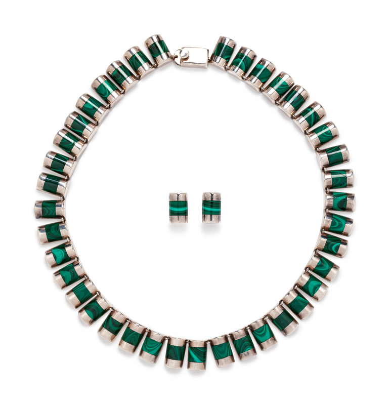 A Sterling Silver and Malachite Necklace and Earring Set, J. Comes, Mexico,
