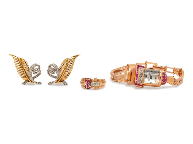 A Collection of Retro Rose Gold, Platinum, Ruby and Diamond Jewelry,