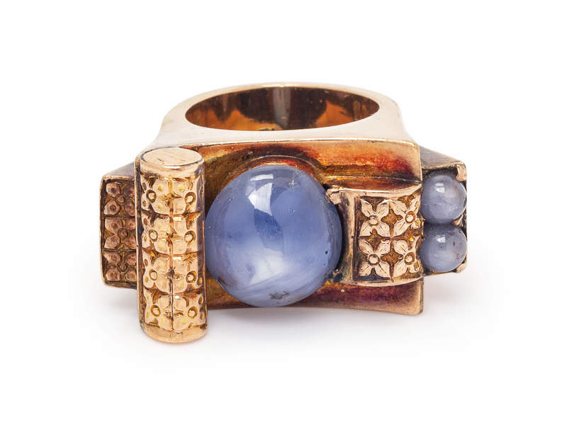 consisting of one oval cabochon cut star sapphire measuring approximately 13.45 x 12.15 mm and two smaller round cabochon cut sapphires measuring approximately 4.60 mm in diameter.